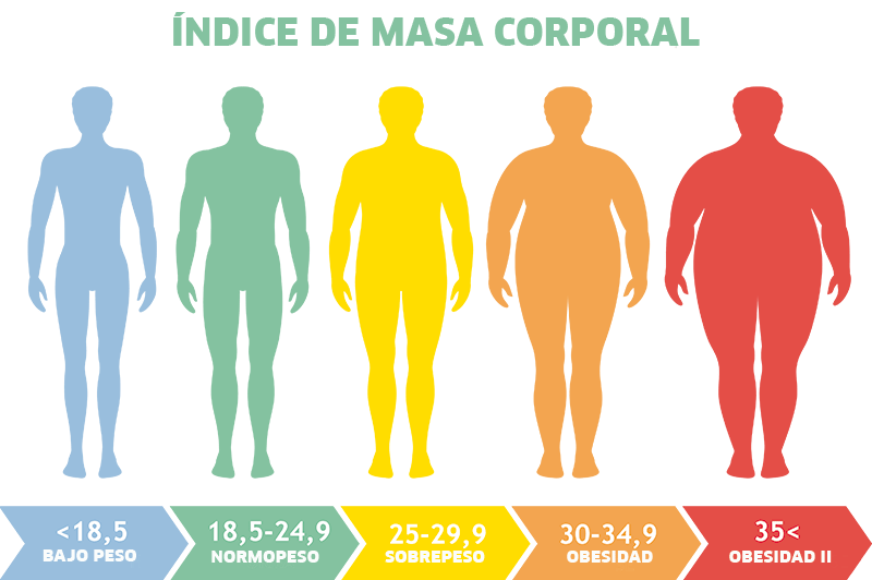 18,5-24,9 Kg/m2 Normopeso./ 25-26,9 Kg/m2 Sobrepeso grado I/ 27-29,9 Kg/m2 Sobrepeso grado II/ 30-34,9 Kg/m2 Obesidad tipo I / 35-39,9 Kg/m2 Obesidad tipo II / 40-49,9 Kg/m2 Obesidad tipo III o mórbida / 50 Kg/m2 Obesidad tipo IV o extrema